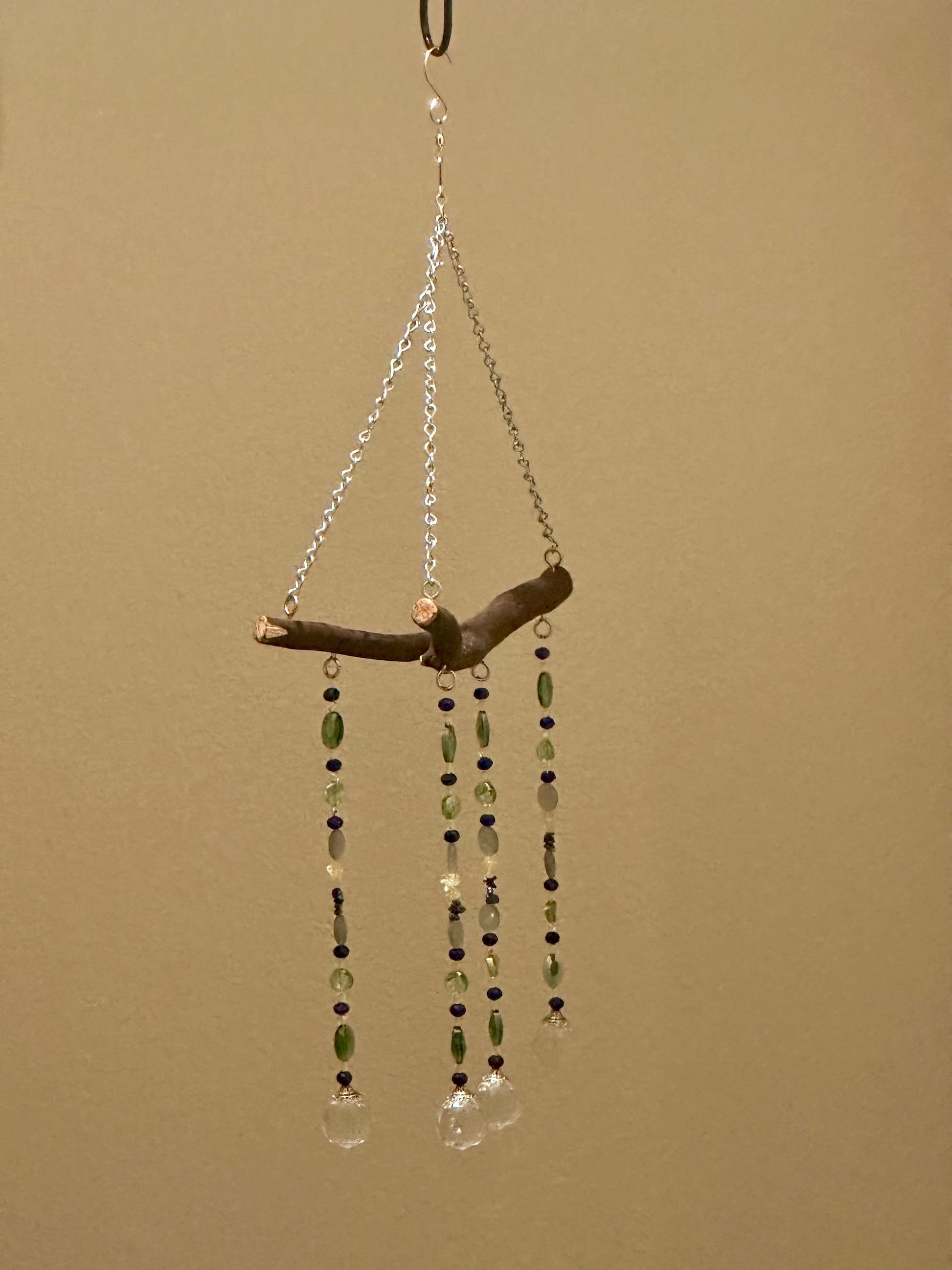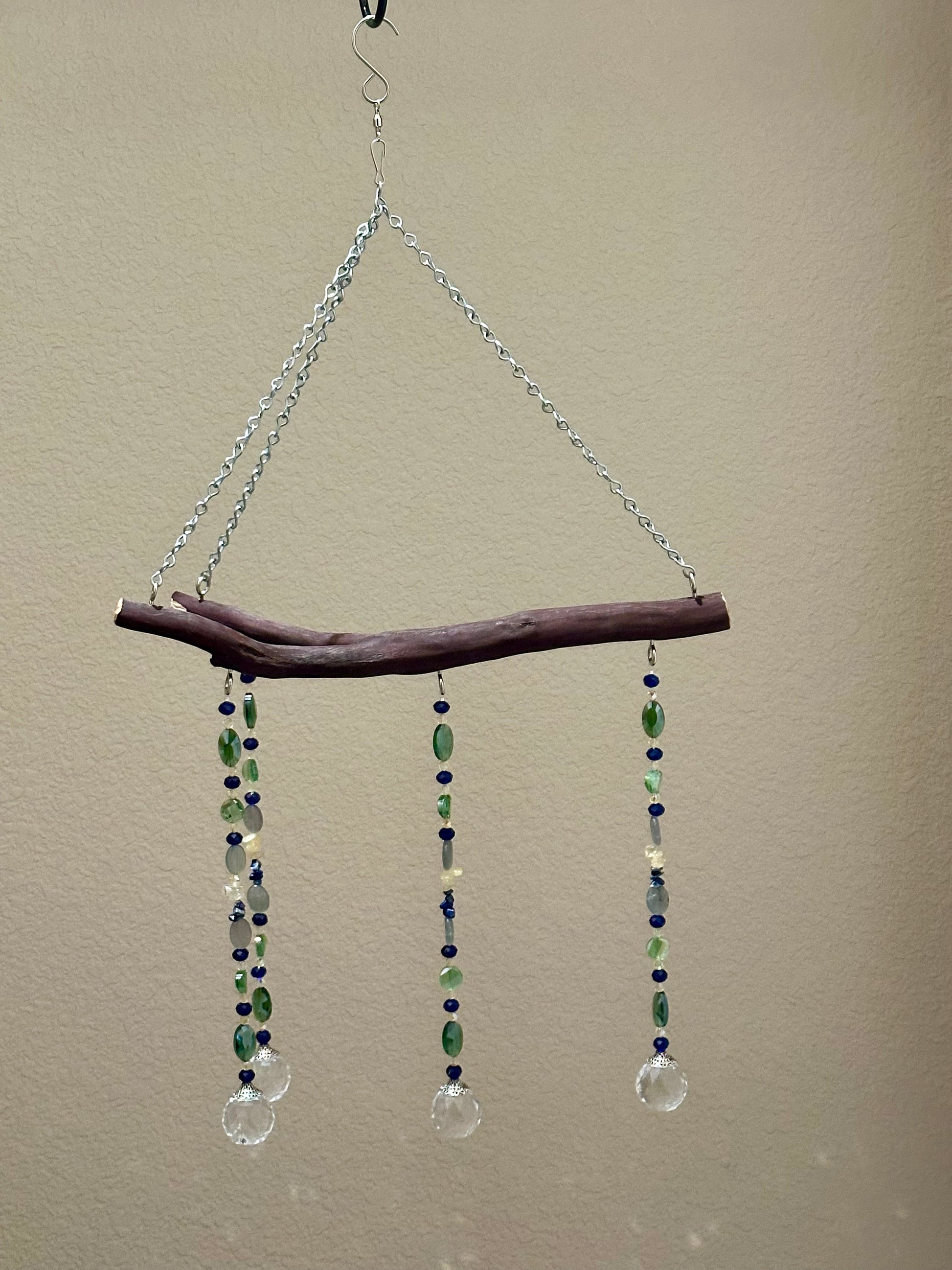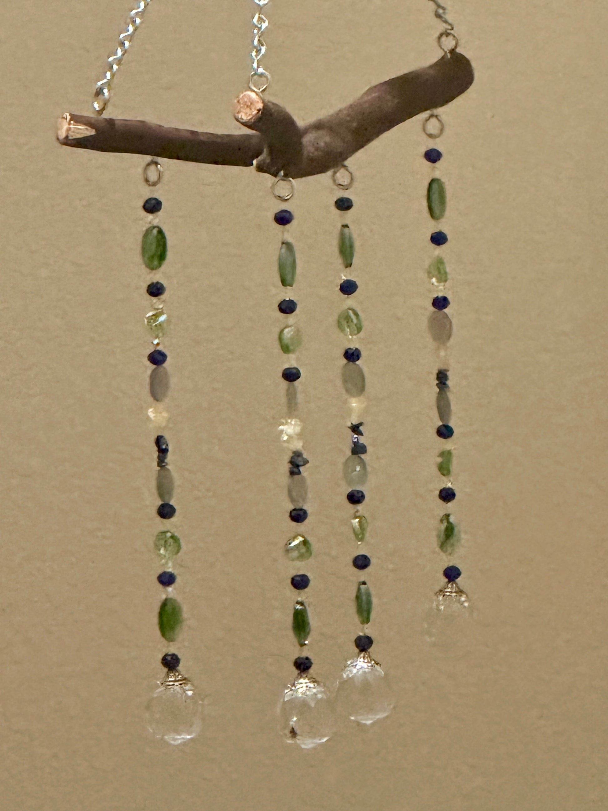 Bring sparkle and color to your space with this 4-string suncatcher mobile, handcrafted on a natural manzanita branch. Featuring a radiant mix of citrine, fluorite, reconstituted lapis lazuli, and faceted glass beads in shades of blue, green, and yellow, it catches the light beautifully—perfect for brightening any window, porch, or garden nook.