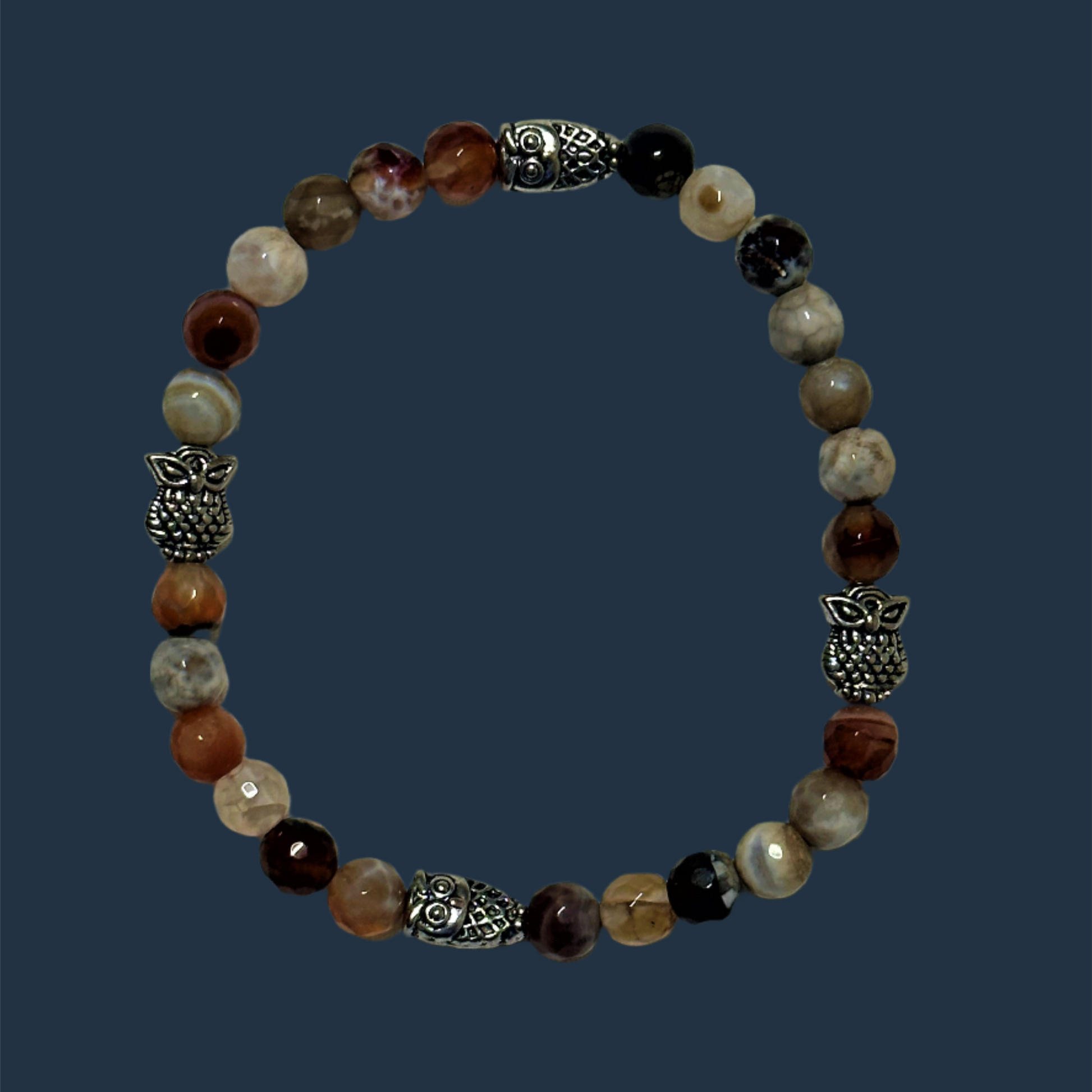This lovely piece features 6 mm earthy-toned agate beads paired with charming silver-plated owls, capturing the essence of a peaceful walk in the woods. Strung on a stretchable band, it ensures a comfortable fit for everyday wear.