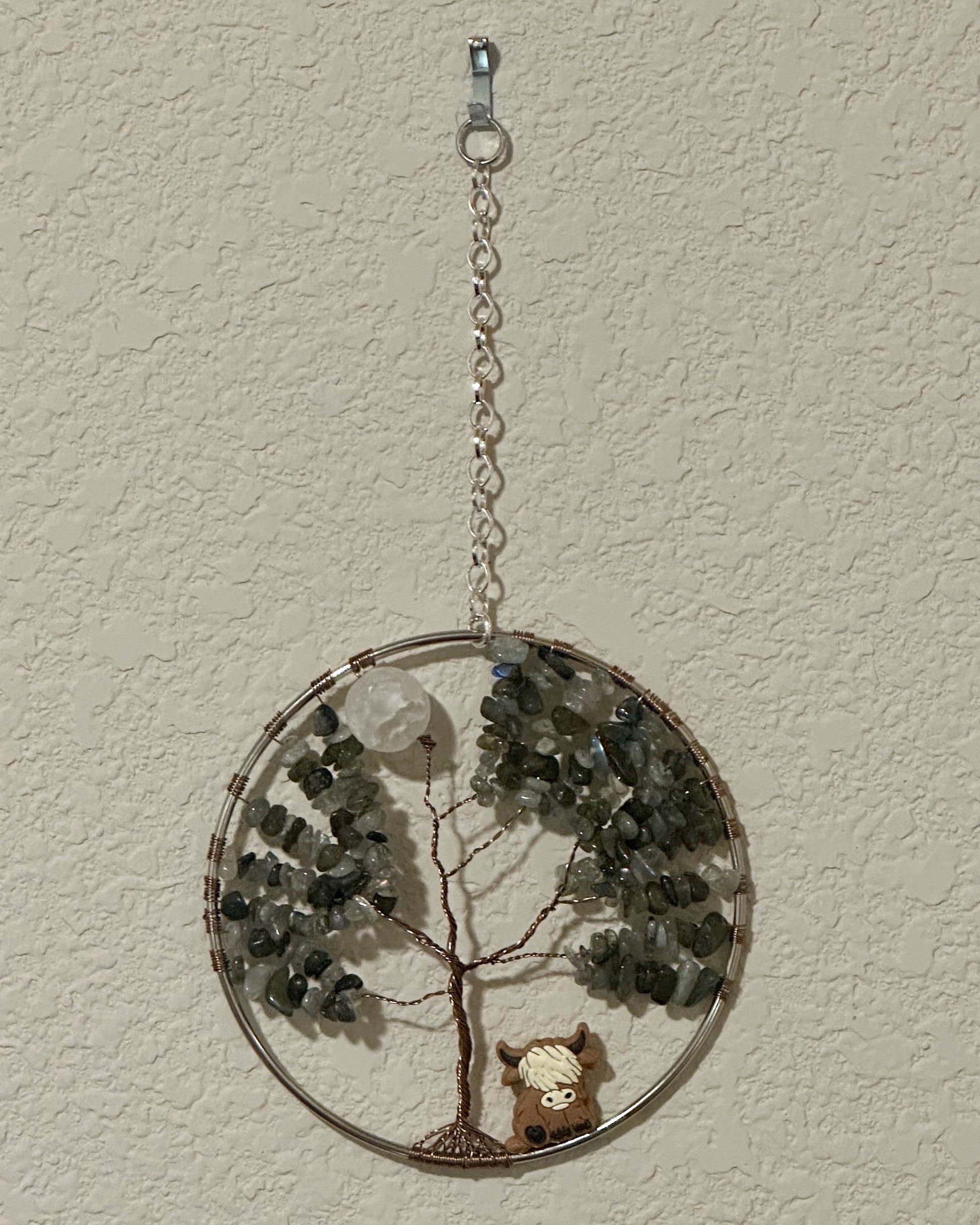 This beautiful piece showcases a handcrafted tree made from shimmering labradorite and white quartz, elegantly wrapped in antique brass. With a charming Highland cow sitting peacefully under the tree, this hanging is perfect for adding a whimsical and artistic flair to any wall or window.