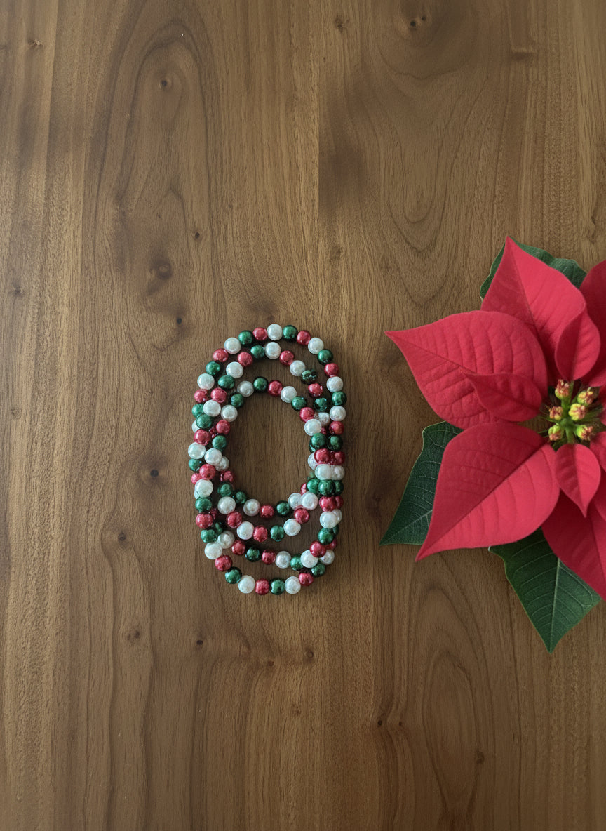 Celebrate the holiday spirit with our Red, Green, and White Stackable Glass Pearl Bracelets.