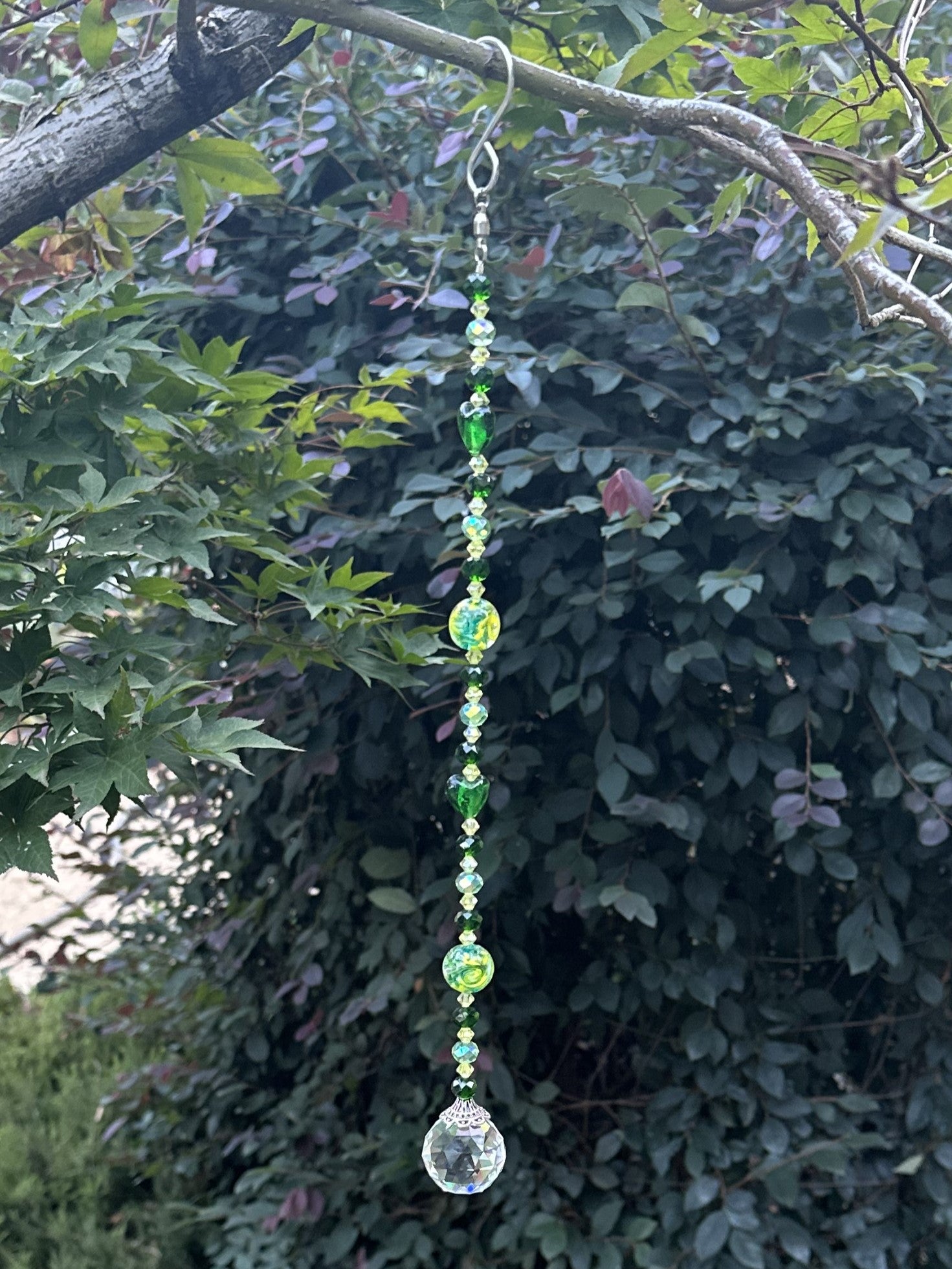 Exquisite suncatcher designed to captivate and enchant with its harmonious blend of light green, dark green, and yellow faceted glass crystal beads. This stunning piece is adorned with dark green glass hearts, dark green and yellow lampwork glass beads, adding an element of elegance and beauty to any space it graces. At the bottom of the suncatcher, you will find a 30 mm crystal prism, which further enhances the visual impact. The prism acts as a focal point, scattering sunlight into a dazzling array of shimmering rainbows, delighting the eye, and uplifting the spirit.
