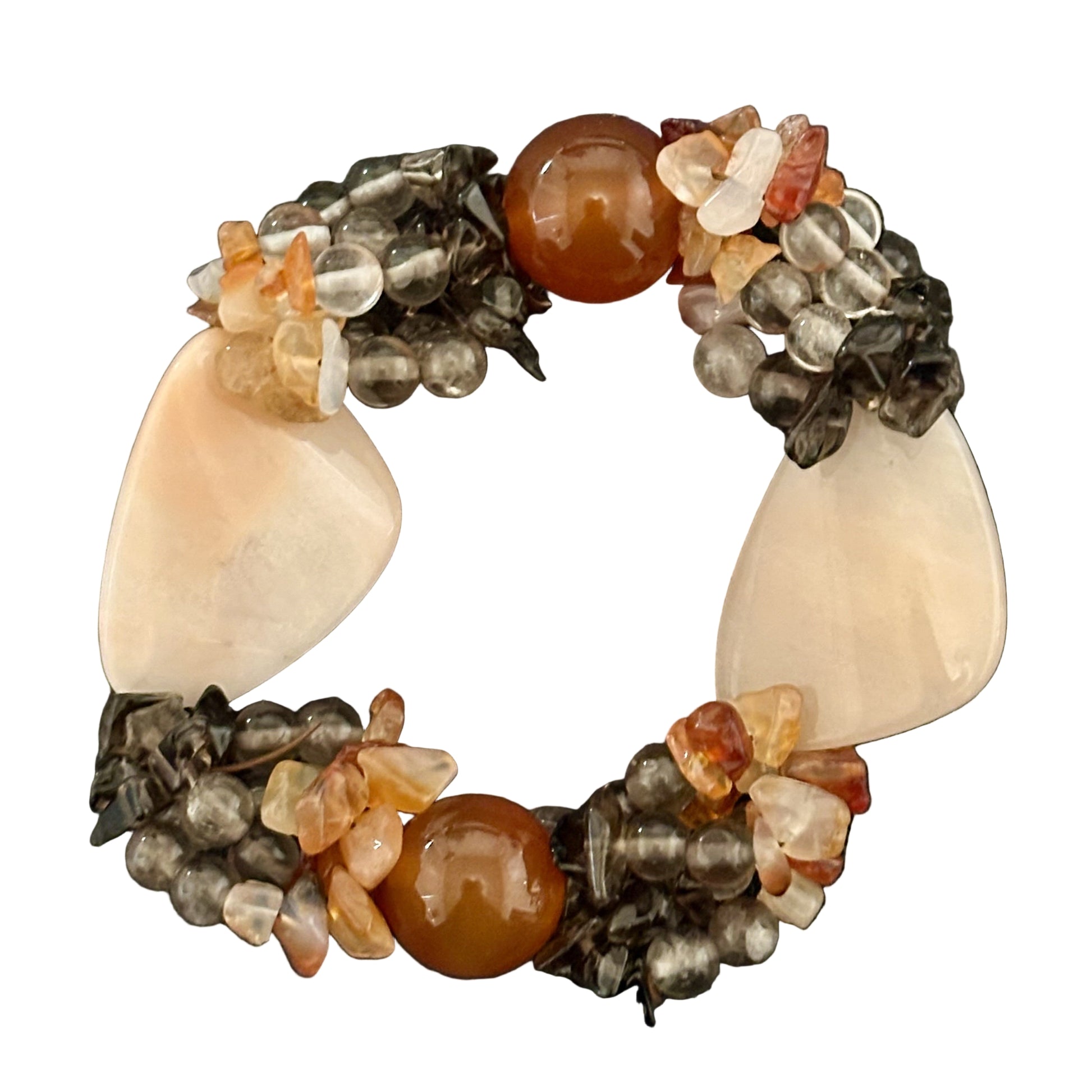This estate sale/thrifted find features carnelian, smoky quartz, and shell beads, creating a timeless, vintage-inspired design. Strung on a stretchable band, it offers a comfortable fit for everyday wear, making it the perfect accessory for any occasion.