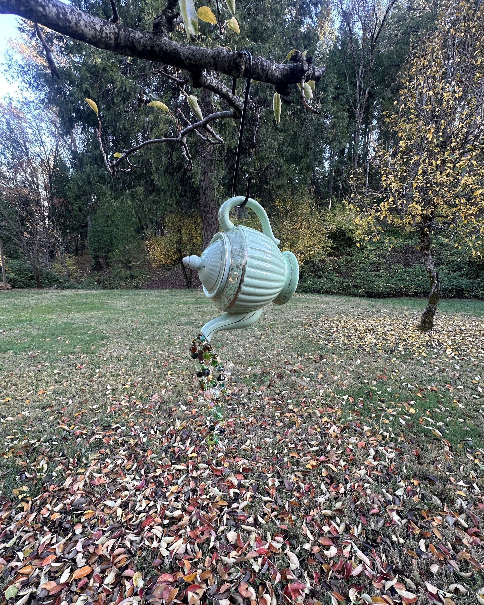 This repurposed vintage ceramic teapot, finished in soft green with elegant gold accents, is transformed into a captivating work of art. From its spout flows a cascade of faceted glass crystals in shades of green, amber, gold, and clear — creating the illusion of light pouring gracefully downward.